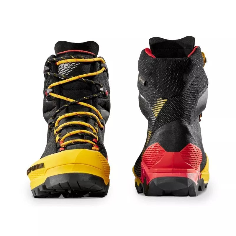 The La Sportiva Aequilibrium ST GTX Black/Yellow is a technical mountaineering and trekking boot designed for via ferratas, glaciers, and varied terrain. The upper is made of high-strength 60/6 nylon with abrasion-resistant sections (HoneyComb Guard™ technology), featuring TPU reinforcements at the toe and heel. A GORE-TEX Performance Comfort membrane guarantees waterproof protection and good ventilation. The Vibram SpringLug Tech outsole with Impact Brake System tread provides traction on rocks and hard ground, while the "Double Heel™" heel construction improves braking on descents and enables a smoother gait, reducing muscle fatigue. The 3D Flex System Evo™ allows ankle mobility while maintaining adequate support. A glass fiber-reinforced nylon footbed adds stability, and lightweight PU foam in the midsole provides cushioning. Half a pair weighs approximately 630g .