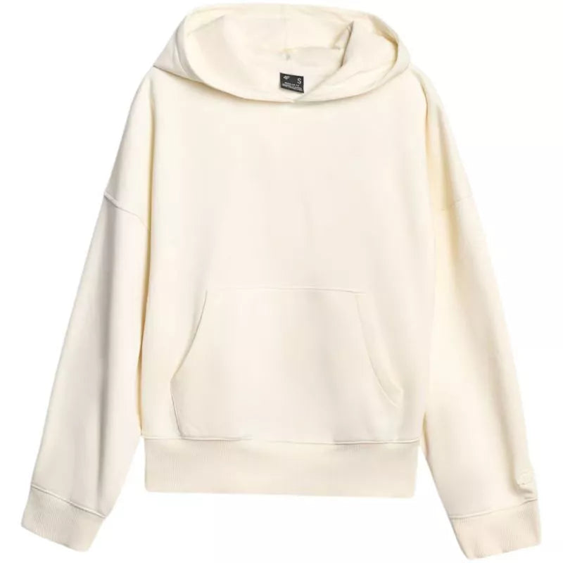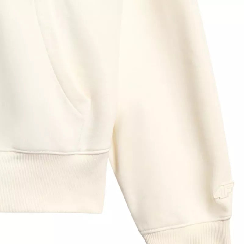 Women's sweatshirt 4F F1887 cream 4FWAW25TSWSF1887 12S Women's sweatshirt is perfect for everyday wear. Technical data: Main material: 80% cotton, 20% polyester Additional material: 100% cotton Additional material 2: 95% cotton, 5% elastane Weight: 350 gsm - thick, durable material ensuring thermal comfort One-sided brushed interior - provides additional warmth and softness from the inside Standard cut - comfortably fits the figure Standard cut reaching to the hips - classic length ensuring a universal fit Made mostly of cotton - soft, durable and pleasant to the touch Addition of polyester - increases the strength of the material and resistance to wear Solid colors - a universal base for various styles Single jersey knit - smooth, soft-to-touch surface Neckline with integrated hood - additional protection and a casual look Ribbed cuffs - stable sleeve finishing Unfastened kangaroo pocket on the front - a convenient place for hands and small items Dropped sleeves - do not restrict movement and emphasize the casual character. Drawstring bottom - ensures a good fit to the figure.