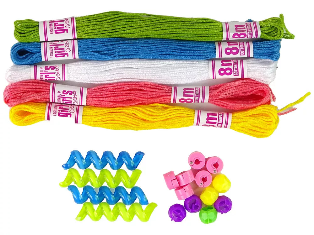 Rinkinyje yra daugybė rožinių, geltonų, violetinių, žalių, mėlynų ir oranžinių atspalvių karoliukų, atveriančių jums begalines kūrybos galimybes. Penki aštuonių metrų ilgio medvilniniai siūlai žalios, mėlynos, baltos, rožinės ir geltonos spalvų leis jums sukurti įvairius stilius. Mėlynos spalvos šukos įtrauktos jūsų patogumui.