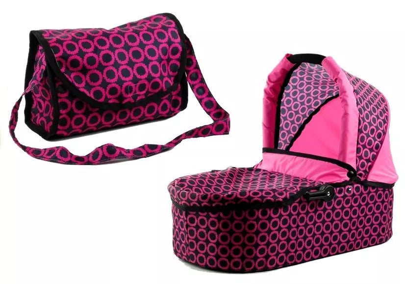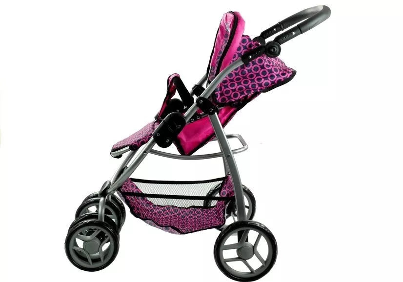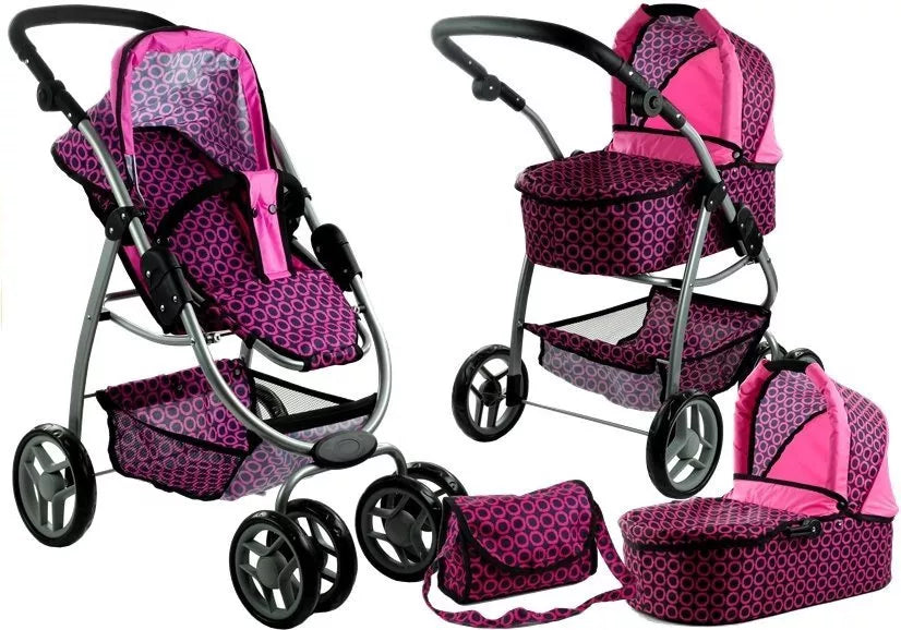 2 viename lėlės vežimėlis-lopšys Alice - rožinis su juodais taškeliais