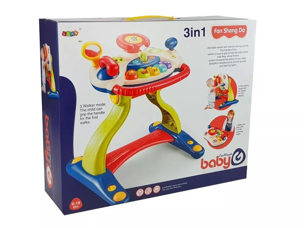 Šis edukacinis žaislas yra idealus produktas pirmiesiems kūdikio gyvenimo mėnesiams. Vaikštynė, sujungta su vairu, kuriame yra spalvingi mygtukai, suteiks jūsų vaikui daug malonumo ir papildomai padės jam pirmaisiais vystymosi mėnesiais. Kai mažylis paliečia pasirinktą elementą, pasirodo šviesos ir garsai, kurie dar labiau pagerina linksmybes. Kūdikis susipažįsta su jį supančiu pasauliu, lavina motorinius ir rankinius įgūdžius, klausą ir gebėjimą suprasti pasaulį, formas ir spalvas. Tai taip pat bus puiki pagalba kūdikio pirmiesiems žingsniams.