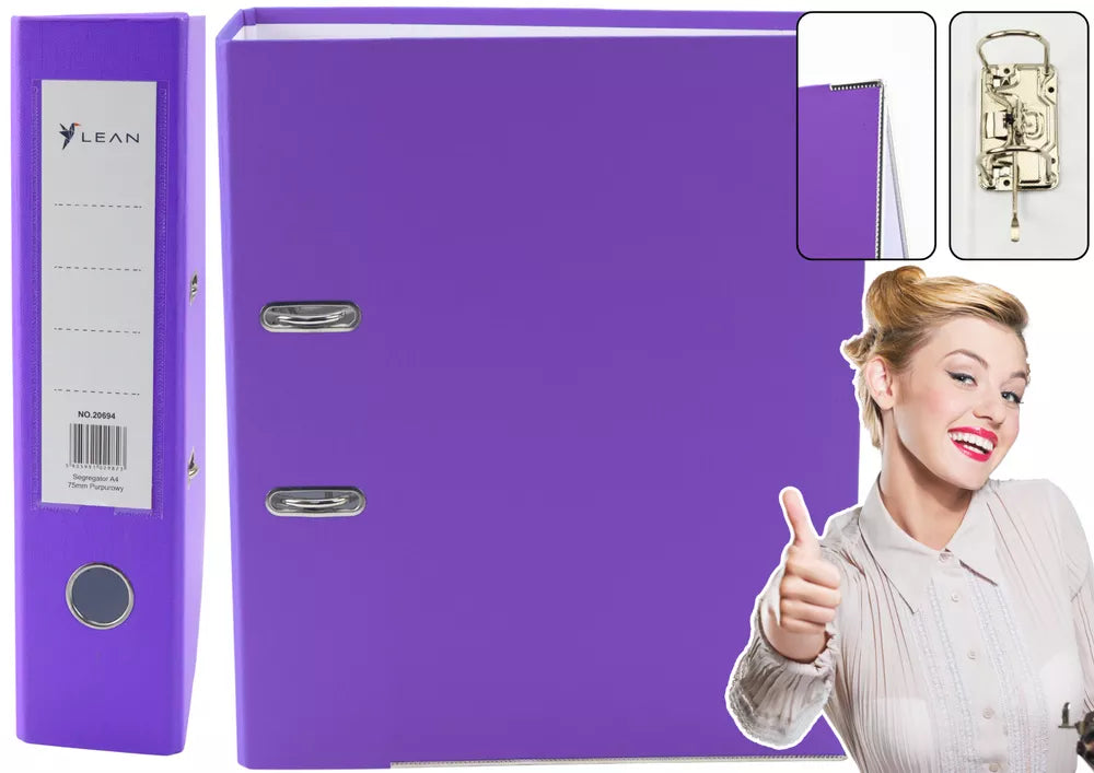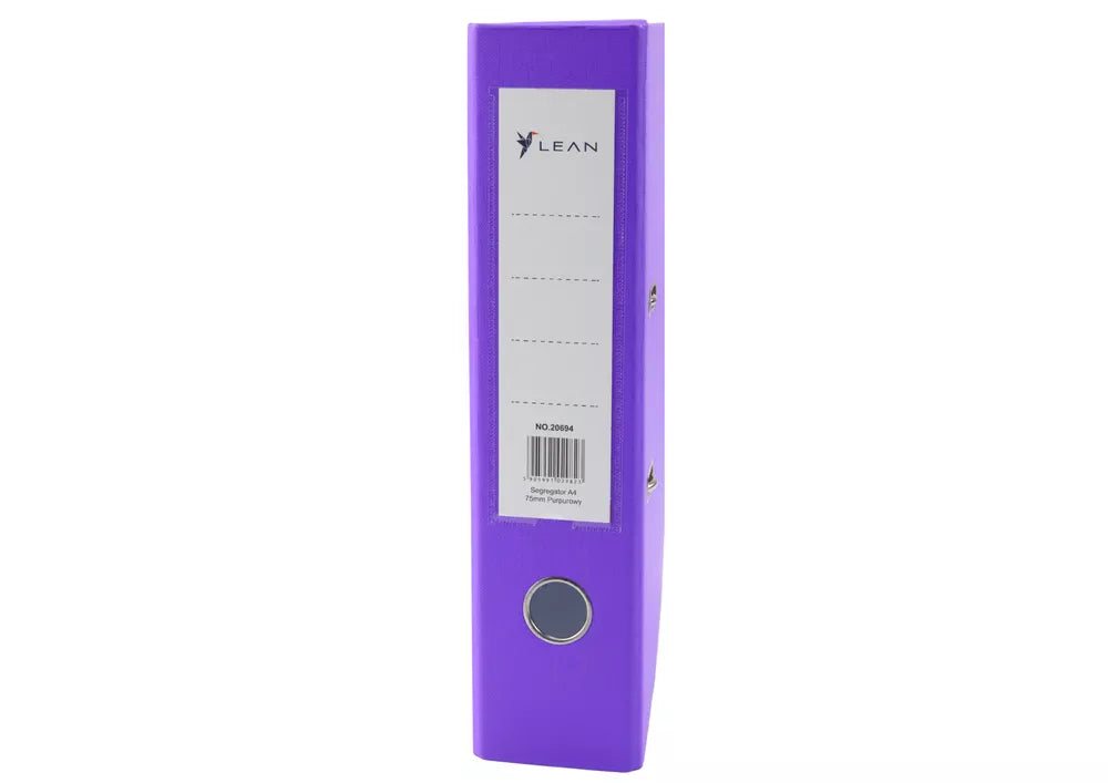 A4 formato dokumentų segtuvas su plačia 75 mm nugarėle elegantiškos, ryškios violetinės spalvos. Puikiai tinka dokumentams laikyti biure, namuose ir mokyklinėms priemonėms tvarkyti. Šis erdvus segtuvas gali talpinti iki 500 lapų (kurių svoris 80 g/m²), todėl tai puikus sprendimas archyvuoti sąskaitas faktūras, sutartis, ataskaitas ir kitus svarbius dokumentus. Aukštos kokybės konstrukcija užtikrina, kad segtuvas būtų patikimas ir ilgaamžis.