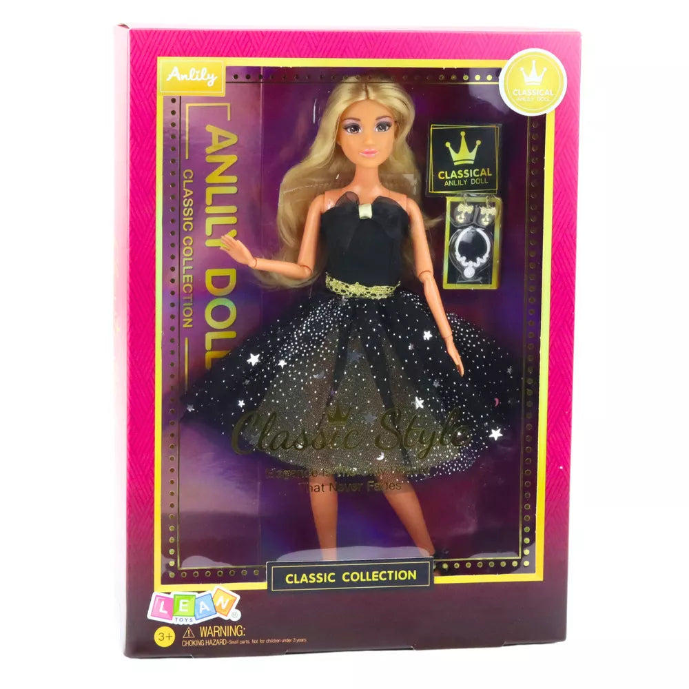 Anlily lėlė, juodas ir auksinis pokylių kostiumas, judinamos galūnės, šviesūs plaukai