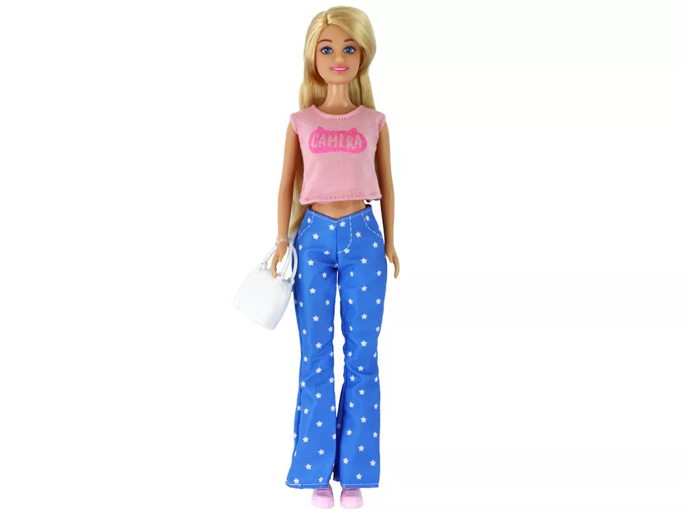 Lėlė apsirengusi rožine palaidine, mėlynomis kelnėmis į apačią su žvaigždėmis ir rožiniais sportiniais bateliais, kurie suteikia jai stilingą išvaizdą. Bet tai dar ne viskas! Į rinkinį taip pat įeina balta rankinė ir mėlyni akiniai, kurie leidžia dar kūrybingiau linksmintis ir kurti stilių.