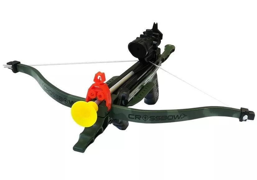 Pažangi mūsų arbaleto konstrukcija reiškia, kad kitos arbaleto versijos, pagamintos iš dviejų medžio gabalų, bus pamirštos. Pagrindinis ginklo korpusas pagamintas iš aukštos kokybės tamsiai žalios spalvos plastiko, suteikiančio jam karinį pobūdį. Arbaletas turi optinį taikiklį ir lazerinį taikiklį – įjungus raudonas taškelis rodo vietą, į kurią taikomės. Įdomiausia šio žaislinio arbaleto funkcija yra pusiau automatinis įtempimas. Jūsų vaikui nebereikia grumtis bandant įtempti stygą – naudojant svirtį, esančią galinėje arbaleto korpuso dalyje, virvelė automatiškai įtempiama į paruoštą padėtį.