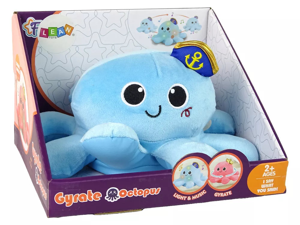 Aštuonkojis turi 8 minkštus čiuptuvus, kurie puikiai tinka apkabinimui ir glostymui. Bet tai dar ne viskas! Šis žaislas tampa dar magiškesnis, kai įdedate 3 AA baterijas (nepridedamos). Įjungus aštuonkojis pradeda groti linksmomis melodijomis, šoka (sukasi ir važinėja) ir šviečia įvairiomis spalvomis. Ypač žavinga naktį, kai aštuonkojo spalvos sukuria gražų šviesos efektą.