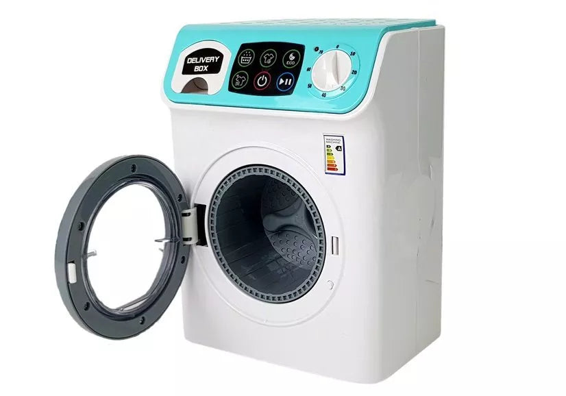 Geros kokybės plastiko skalbimo mašina, gražių baltos ir mėtinės spalvų bei lipdukų. Skalbimo mašina turi atidaromą būgną ir ištraukiamą skalbiklių stalčių. Uždarius dureles, ji automatiškai įsijungia ir pradeda suktis būgnas. Variklis skleidžia triukšmą, kai veikia skalbimo mašina. Veikia kaip tikra! Turi lipduką su lietimui jautriu skydeliu programoms nustatyti. Tiesiog nustatykite programą, pasukite judinamą rankenėlę su apšviestu diodu temperatūrai nustatyti, įdėkite drabužius ir viskas paruošta. Smagiai praleiskite laiką!
