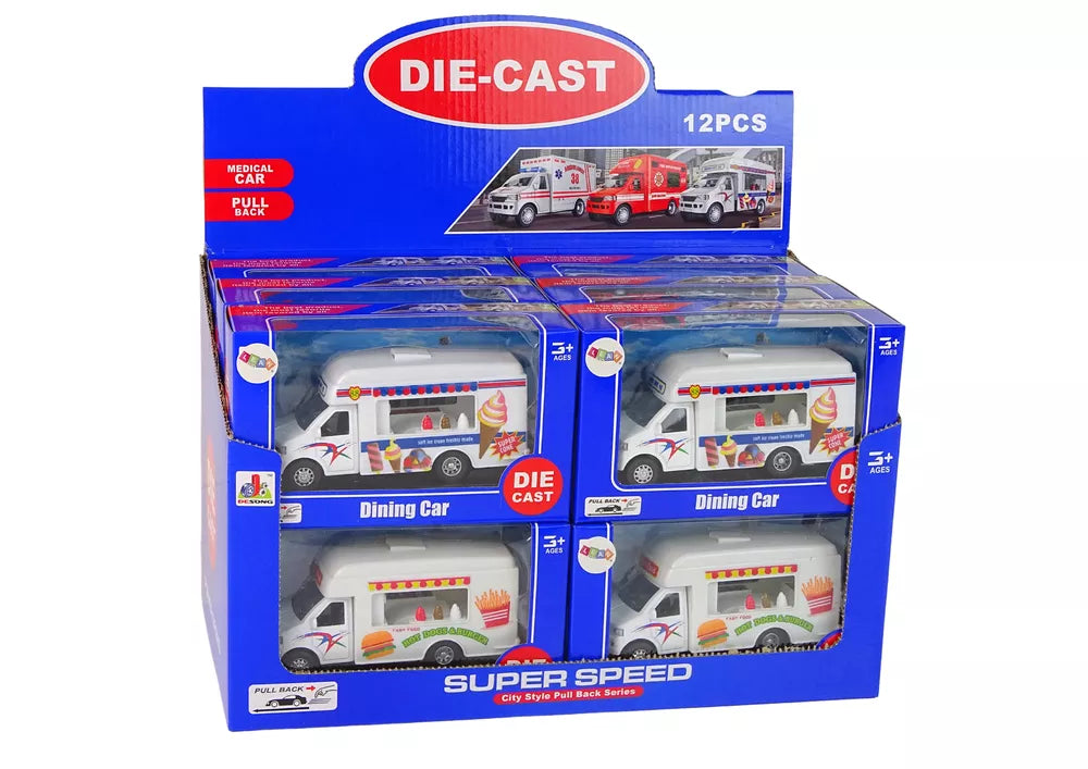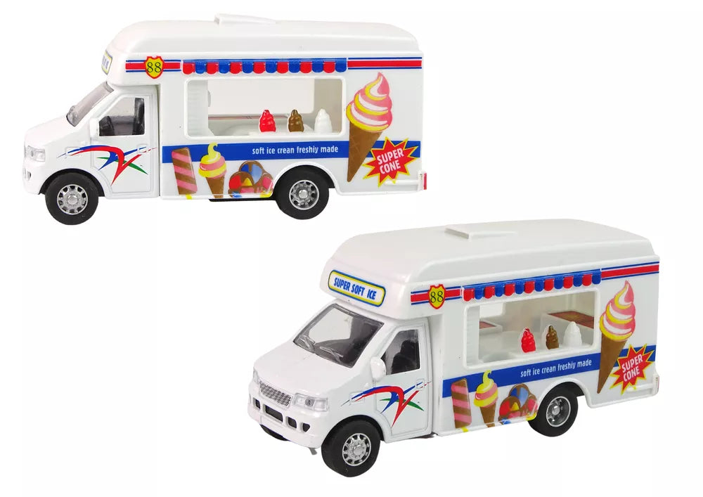 Į rinkinį įeina dvi kemperio versijos. Vienas iš jų veikia kaip ledų krautuvėlė, kitas – kaip greito maisto transporto priemonė. Tapkite vairuotoju, kuris padarys kiekvieną vaiką, kurį sutiksite kelyje, laimingą skaniu maistu. Kemperiai pagaminti baltos spalvos su konkrečiam modeliui skirtukais lipdukais.