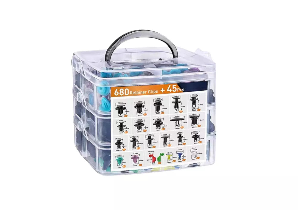 Automobilinių spaustukų rinkinys su organizatoriumi 680 vnt. – universalus rinkinys profesionalams ir „pasidaryk pats“ entuziastams