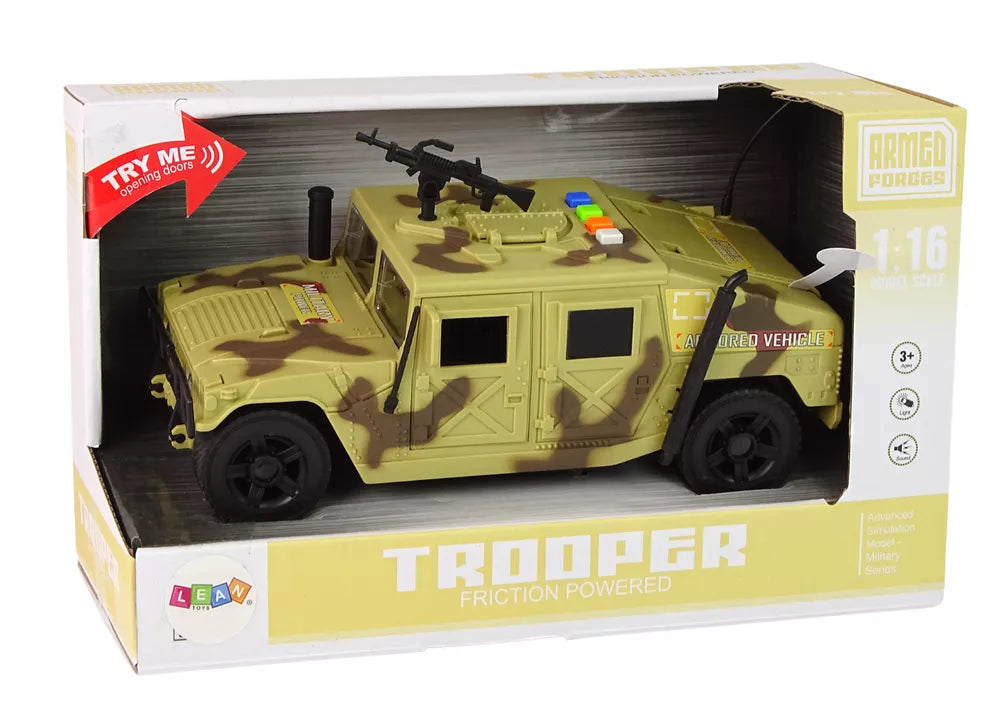 Transporto priemonė turi karo spalvas, platų korpusą, patranką ant stogo, kuri imituoja tikro automobilio vairavimą. Ant stogo yra 4 mygtukai, atsakingi už skirtingus garso triukšmus. Garso signalas, šūviai, važiavimas atbuline eiga ir automobilio užvedimas. Visa tai lydi priekiniai žibintai. Kiekviena detalė identiška tikrai transporto priemonei.