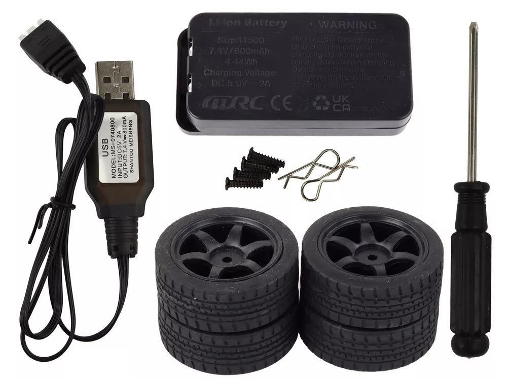 Papildomi kelio ratai su guminiu protektoriumi, įtraukti į rinkinį, leidžia pritaikyti automobilį įvairioms vietovės sąlygoms, užtikrinant lankstumą ir prisitaikymą prie įvairių paviršių.