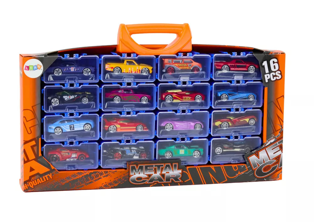 Automobilių rinkinys su spyruoklėmis metaliniame lagamine, 16 vienetų