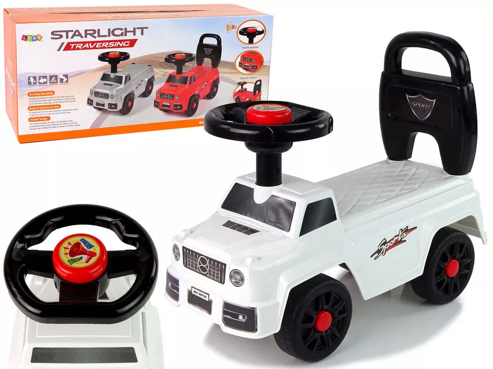 Šis paspiriamas automobilis yra daugiafunkcinis žaislas jūsų mažyliui. Jis skirtas vaikui, kuris gali savarankiškai atsispirti nuo žemės kojomis. Žaislinis automobilis augs kartu su jūsų vaiku ir jo įgūdžiais. Šis stumdomas žaislas puikiai tinka tiek namuose, tiek kieme ar sode. Šios transporto priemonės naudojimas kasdieniame žaidime daro didžiulį poveikį jų vystymuisi. Paspiriama mašinėlė lavina daugelio vaiko kūno dalių koordinaciją vienu metu, vysto raumenis ir, kas ne mažiau svarbu, padeda išmokti savarankiškai ir stabiliai vaikščioti. Važinėjimas baltu paspiriamu automobiliu padės jūsų vaikui suprasti, kas yra greitis, atstumas ar kryptis.