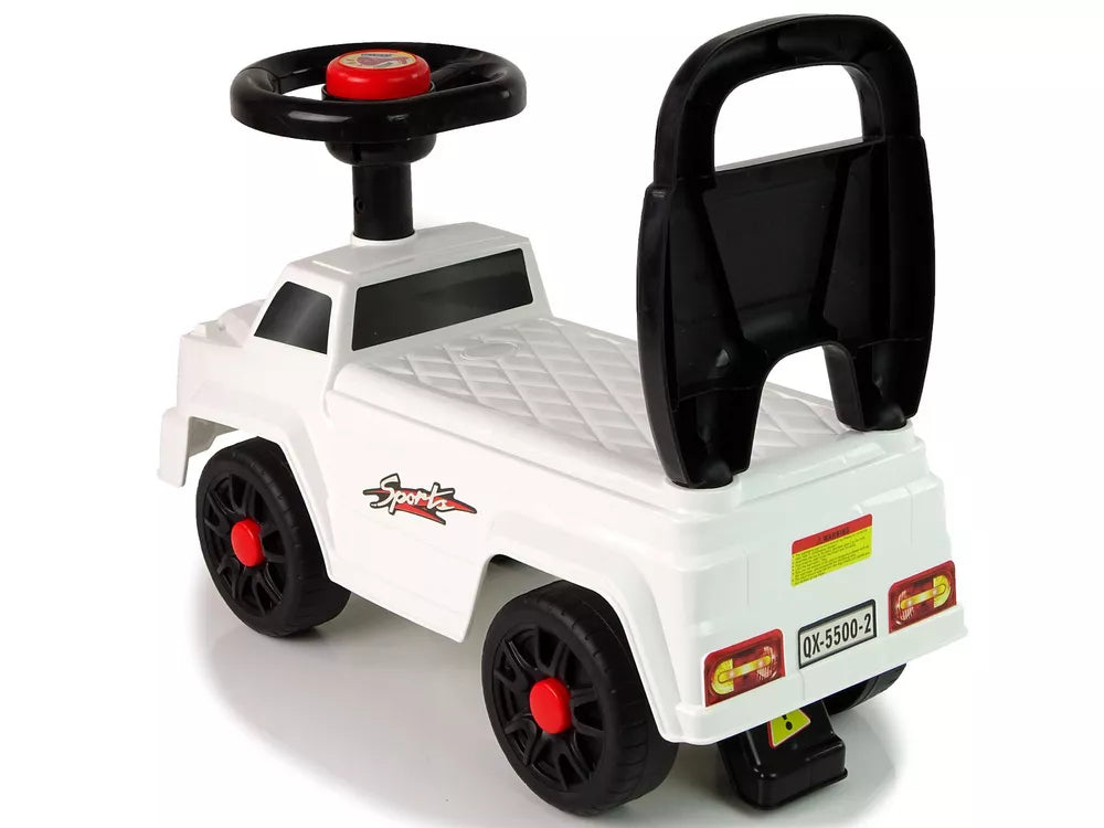 Vaikiška mini transporto priemonė buvo sukurta atsižvelgiant į smulkiausias detales. Lipdukai žibintų ir grotelių pavidalu sukuria tikroviško automobilio įspūdį. Jis pagamintas iš lengvos plastikinės konstrukcijos, kuri yra labai tvirta ir patvari. QX-5500-2 mažylis gali pasiimti QX-5500-2 vaikišką automobilį su savimi pasivaikščioti. Vairo viduryje yra signalas, kuris praneš, kad mažasis vairuotojas yra kelyje. Automobilio gale yra atlošas, kuris neleidžia visam automobiliui pasvirti atgal. Atlošas neleidžia vaikui atsilošti atgal, todėl jis stabiliai sėdės ant paspiriamos mašinėlės.