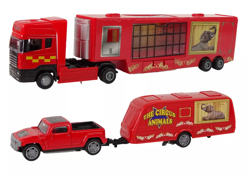 Puikus rinkinys kiekvienam mažam automobilių ir gyvūnų gerbėjui. Cirko gyvūnų transporto priemonių rinkinys yra puiki dovana. Jūsų vaikas ras ir didelį sunkvežimį gyvūnams vežti, ir pikapą su karavanu.