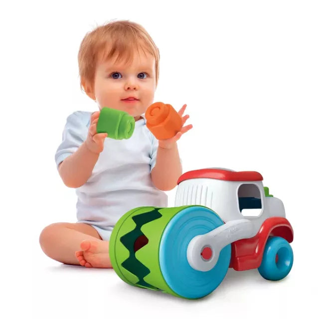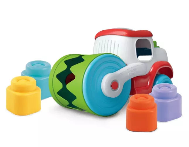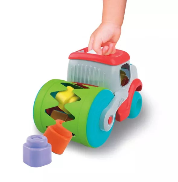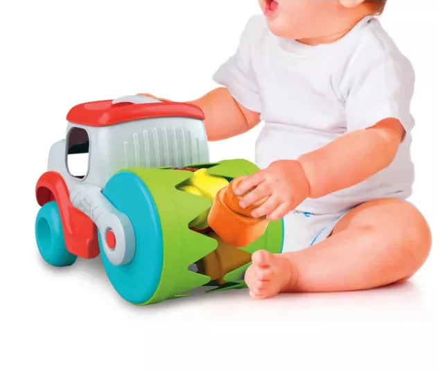 Vaikai gali „šerti“ kaladėlėmis minkštą riedį, statyti bokštus, dėti kaladėles per langą ir išimti jas iš galinio skyriaus.