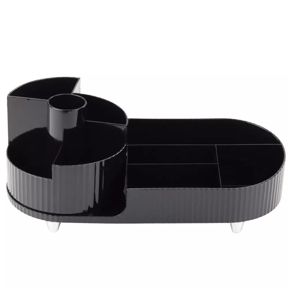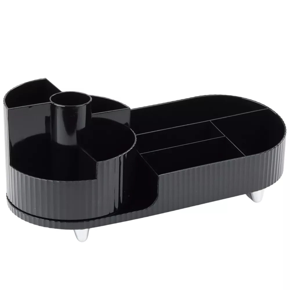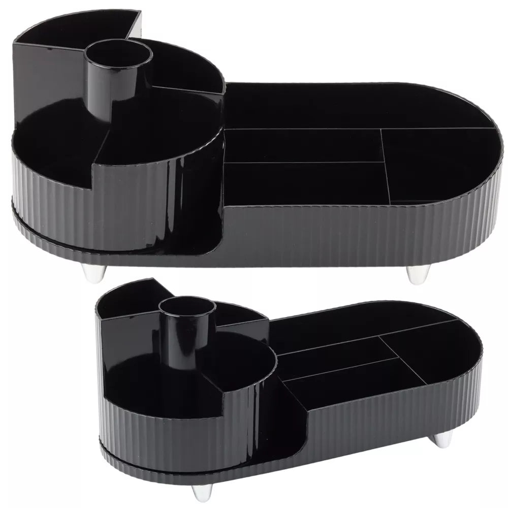 Elegantiškas, besisukantis juodos spalvos organizatorius yra universalus ir funkcionalus sprendimas, puikiai tinkantis tiek vonios kambaryje, tiek ant stalo. Dėl apgalvoto dizaino ir praktiškų skyrelių šis gaminys leidžia patogiai laikyti daiktus. Tai taip pat gali būti praktiškas sprendimas mokyklinių ir biuro reikmenų laikymui ant stalo.