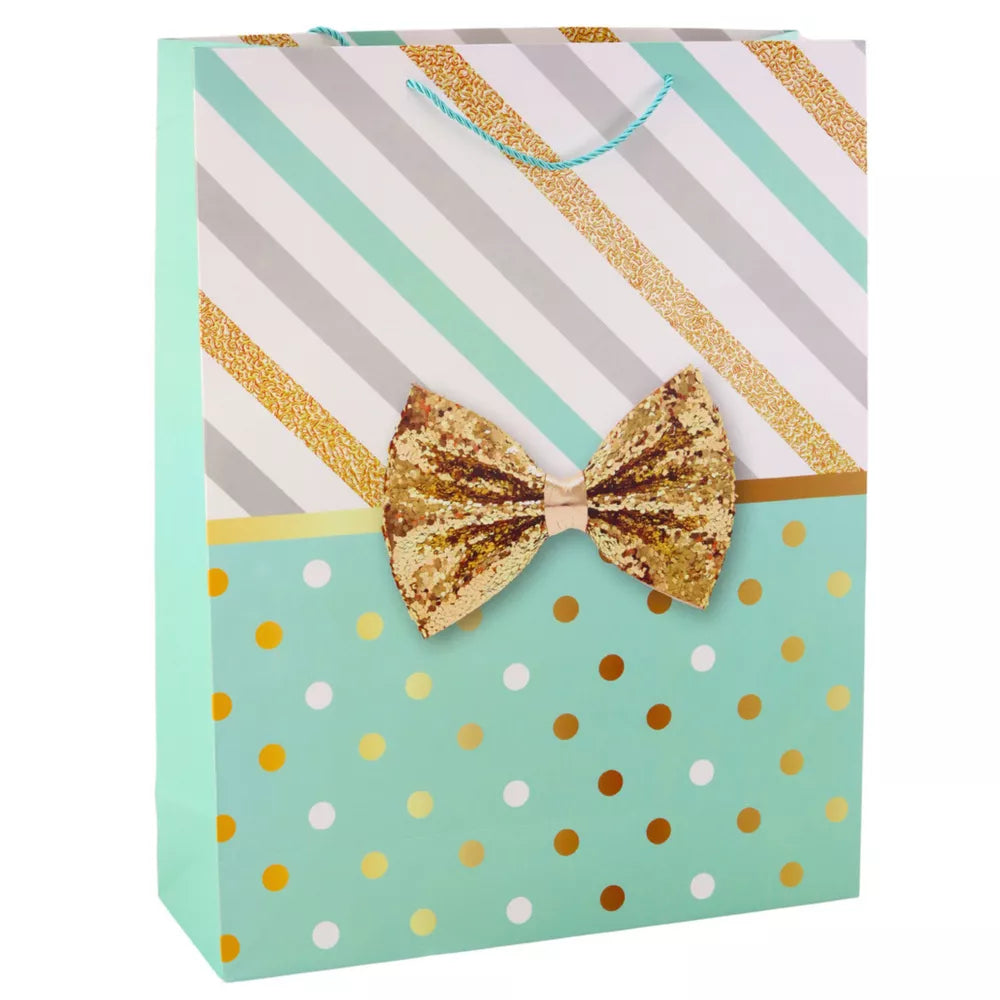 Elegantiškas didelio formato dovanų maišelis su unikaliu raštu, derinančiu dryžius ir taškelius su aukso dekoracijomis ir dekoratyviniu kaspinėliu. Šis unikalus klasikinės estetikos ir modernaus stiliaus derinys daro maišelį patrauklų ir idealiai tinkantį ypatingoms progoms. Galima rinktis iš keturių pastelinių spalvų – mėtų, mėlynos, rožinės ir persikinės – leidžia pasirinkti variantą, labiausiai tinkantį šventės pobūdžiui ar dovanos gavėjo pageidavimams. Ant priekio uždėtas blizgantis kaspinėlis ir blizgus aukso spalvos spaudinys suteikia maišeliui išskirtinę išvaizdą, todėl tai ne tik praktiška, bet ir estetiška dovanos pakuotė.