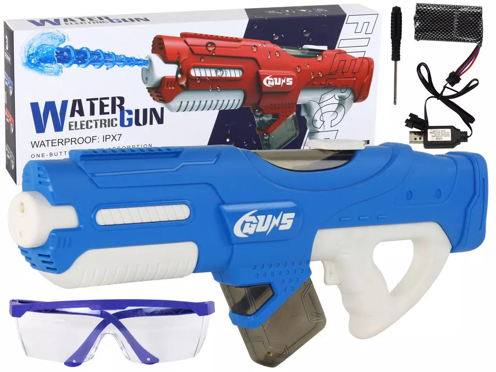 Į komplektą taip pat įeina stilingi akiniai, kurie ne tik apsaugos jūsų akis, bet ir suteiks žavesio jūsų vasaros mūšiams. Šautuvas yra ergonomiškas, lengvai naudojamas ir tuo pačiu metu pasižymi įspūdingu vandens šūvių tikslumu ir atstumu.