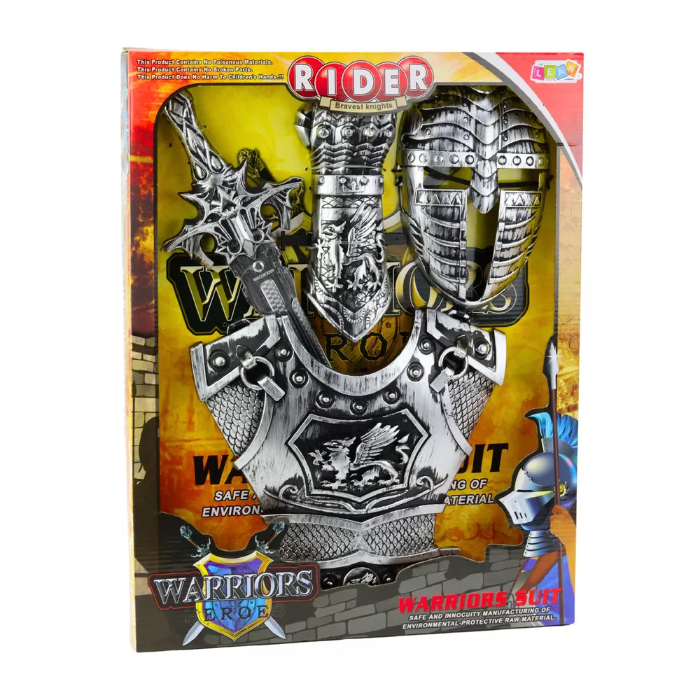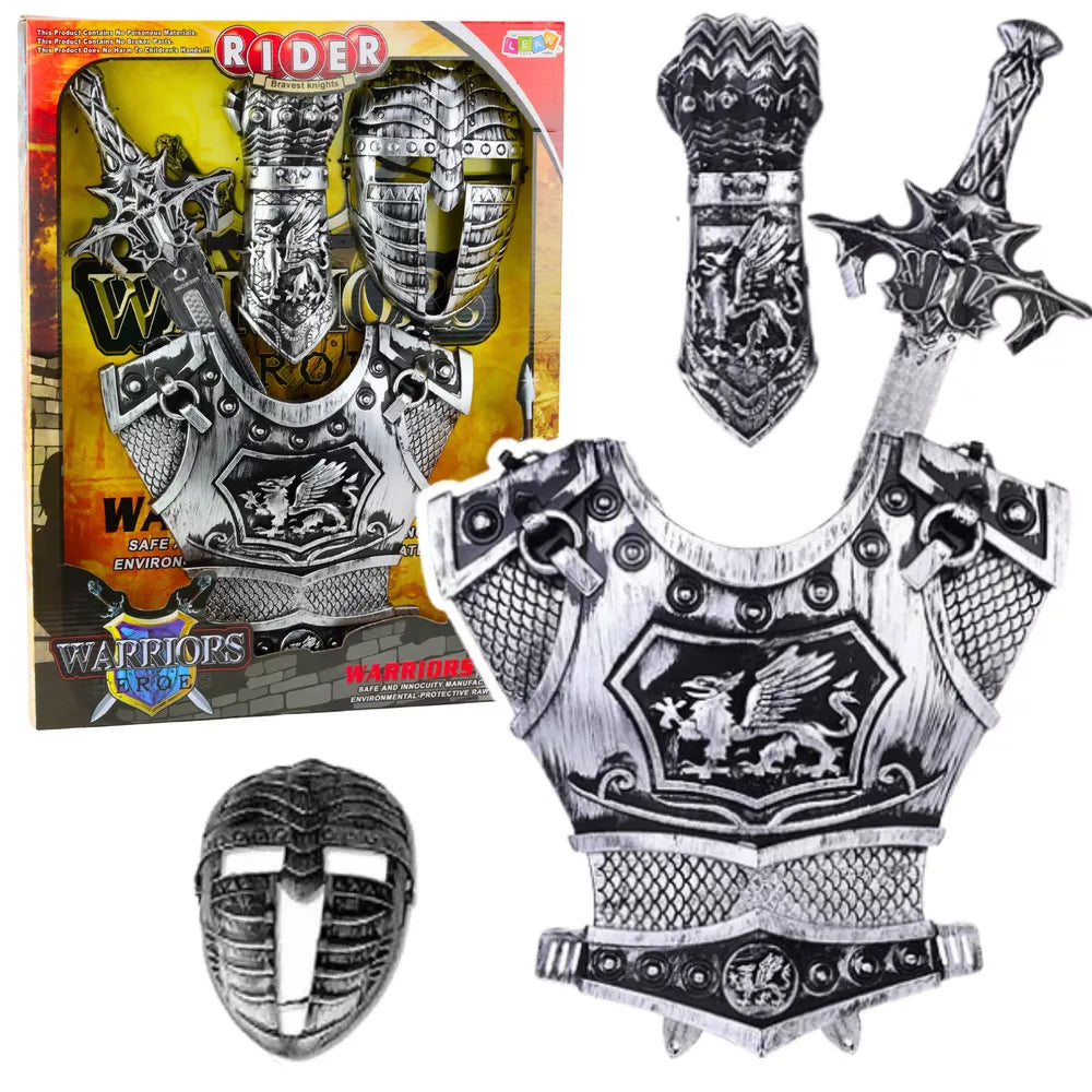 Rinkinį sudaro visi reikalingi elementai, kurie leis sukurti pilną riterio aprangą – tvirtai atrodantys šarvai, skydas, realistiškai atkartotas kalavijas, šalmas ir papildomas dėklas. Visos detalės pagamintos iš plastiko, kuris yra labai atsparus mechaniniams pažeidimams, kartu užtikrinant saugumą patiems mažiausiems.
