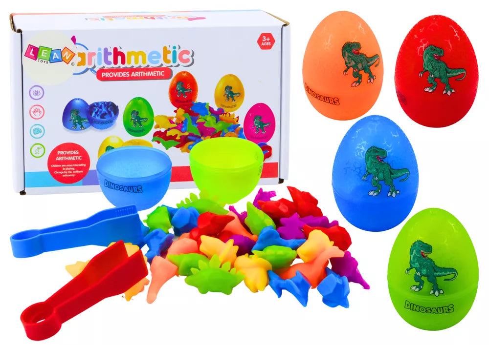 Rinkinį sudaro 6 spalvingi kiaušiniai, kurių kiekviename slepiasi maži dinozaurai, kuriuos vaikas turi priderinti prie atitinkamo kiaušinio. Žaidimas apima dinozaurų rūšiavimą pagal spalvą, o tai padeda išmokti atpažinti spalvas ir lavina loginį mąstymą.