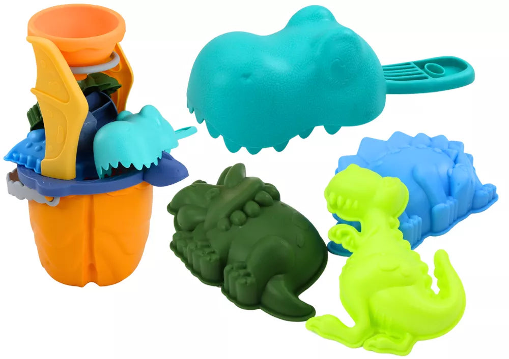 Dinozaurų smėlio rinkinys, piltuvėlis, malūnėlis, formelės, kastuvėlis, 7 dalys.