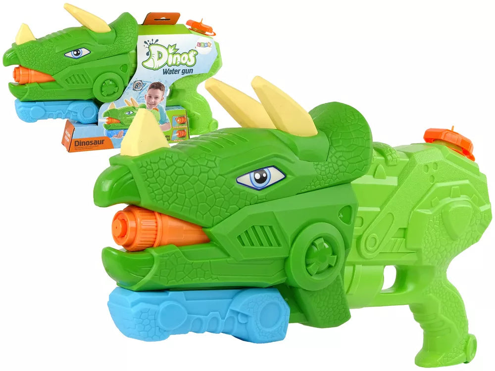 Dinozauras turi guminį išsikišusį galą, todėl yra visiškai saugus mažyliams. Pumpuojant rankena, vanduo iš rezervuaro liejasi dinozauro burna. Rezervuare telpa maždaug 1330 ml vandens. Šautuvas yra žalios spalvos su oranžiniais elementais ir atrodo kaip animacinio filmo dinozauro personažas.