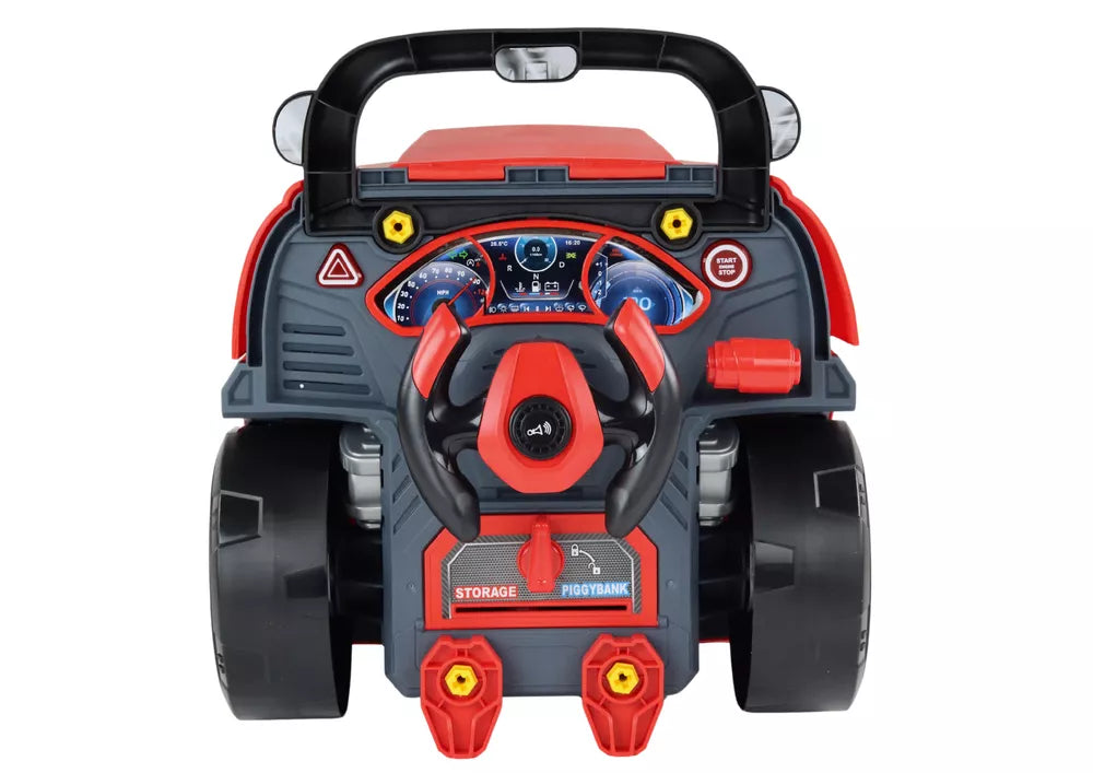 Pagrindinis sunkvežimio skydelis yra tikra pramogų ir sąveikos zona. Vairas, kuris sukasi į dešinę ir į kairę, suteikia autentišką vairavimo patirtį, o garsinis signalas suteikia papildomo linksmumo ir realistiškumo. Avarinis mygtukas su šviesos ir garso efektais leidžia apsimesti, kad esate krizinėje situacijoje, kurią jūsų vaikas gali atkurti savo vaizduotėje. Paleidimo-sustabdymo mygtukas įjungia tikroviškus transporto priemonės garsus, o pavarų perjungiklis leidžia imituoti krypties keitimą.