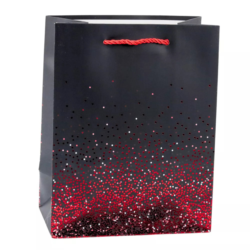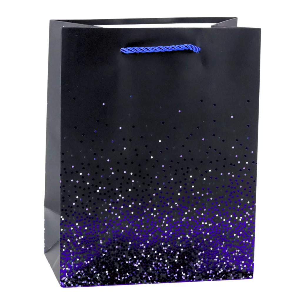 Maišelis yra keturių spalvų: geltonos, violetinės, raudonos ir turkio. Kiekviena spalva papildyta juodu fonu, kuris pabrėžia eleganciją ir kontrastuoja su blizgančiais blizgučiais. Tvirtos virvelinės rankenos, spalviškai priderintos prie gradiento, užtikrina patogų nešimą, o tvirta konstrukcija garantuoja saugų net ir sunkesnių dovanų laikymą.