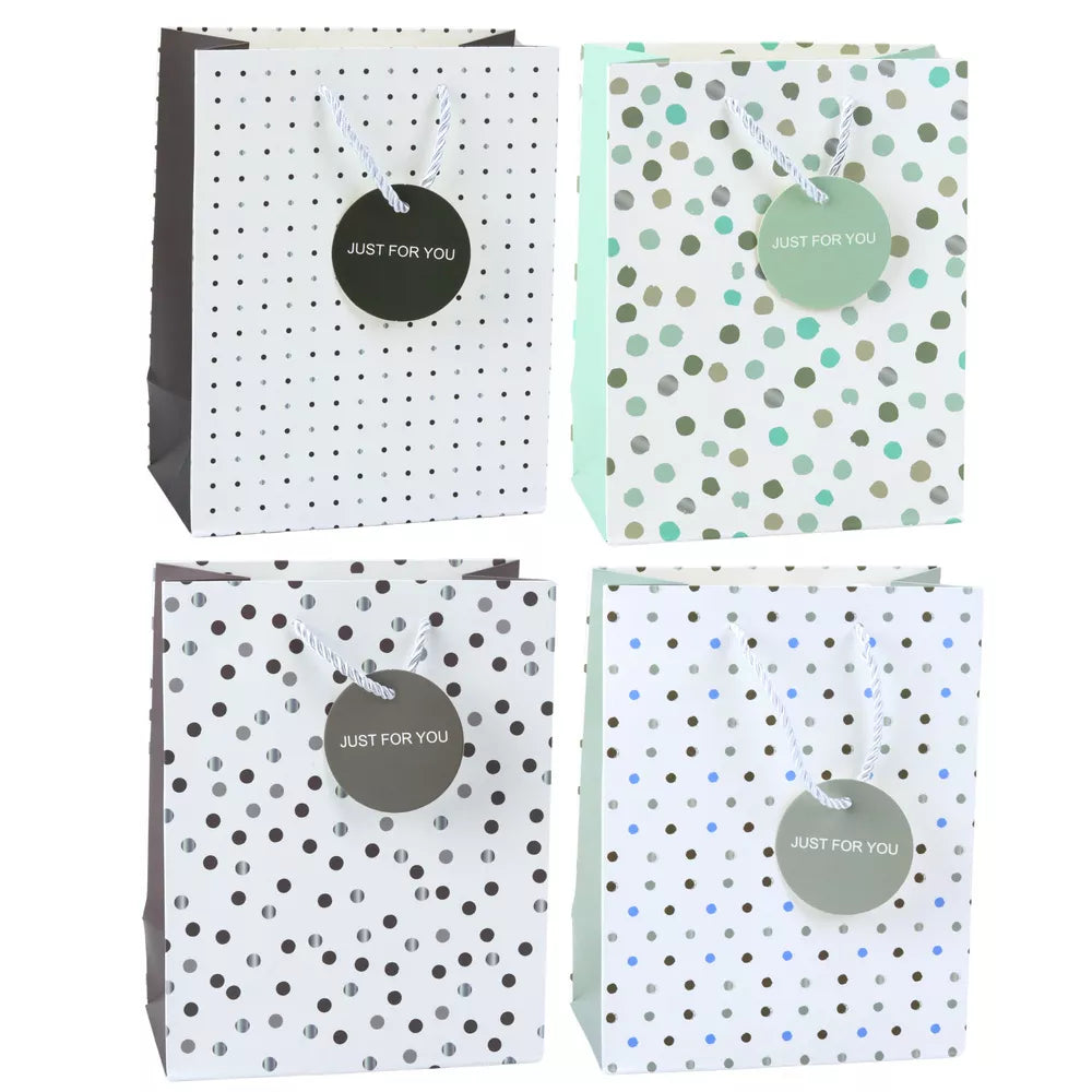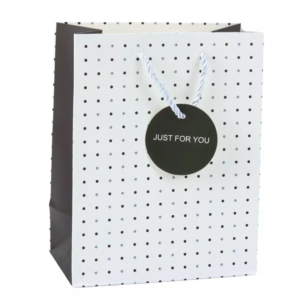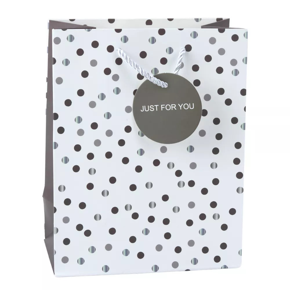 Dovanų maišelis su taškų motyvu ir pakabuku pasirašymui yra elegantiškas ir universalus būdas supakuoti dovaną bet kokiai progai. Pagamintas iš aukštos kokybės dekoratyvinio kartono, jis išsiskiria subtiliu taškų raštu sidabro, žalios ir juodos spalvų atspalviais, kuris suteikia jam modernų ir stilingą charakterį. Dėl savo paprastumo ir elegancijos maišelis puikiai tinka gimtadieniams, vardadieniams, jubiliejams ar kitoms ypatingoms progoms.