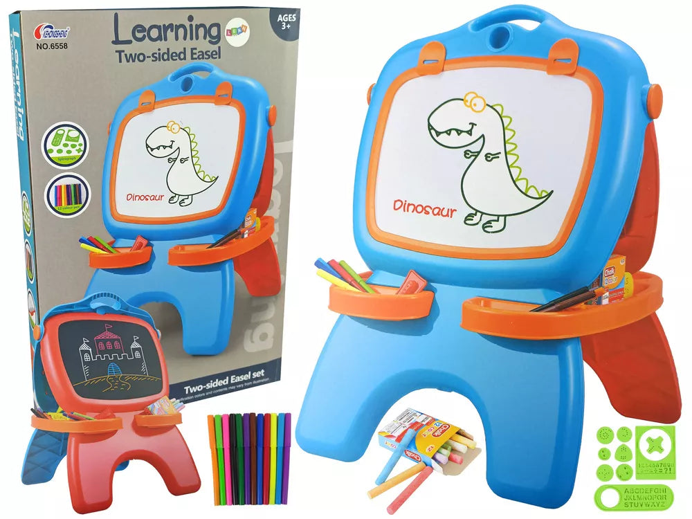 Lenta turi du paviršius piešimui – baltą, skirtą naudoti trinamiems markeriams, ir juodą, ant kurio galima piešti kreida. Rinkinyje yra 12 spalvotų markerių ir 12 kreidelių. Apatinėje lentos dalyje yra mažas stalčius visiems priedams, kai jų nenaudojame arba mums jų šiuo metu nereikia. Be to, lentos viršuje yra kabliukas, esantis virš lentos, kuris taip pat leidžia pritvirtinti popieriaus lapą. Papildomi šablonai su geometrinėmis figūromis ir raidėmis leidžia mažyliui mokytis matematikos ir naujų formų.