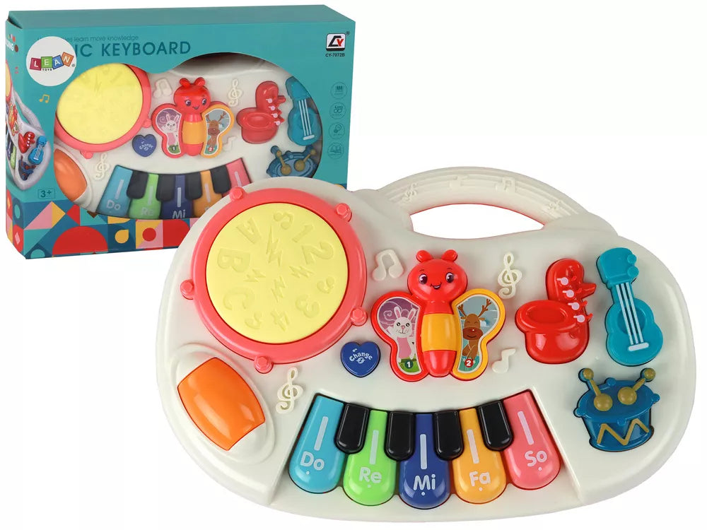 Edukacinis pianinas su klavišais, instrumentais ir drugeliais