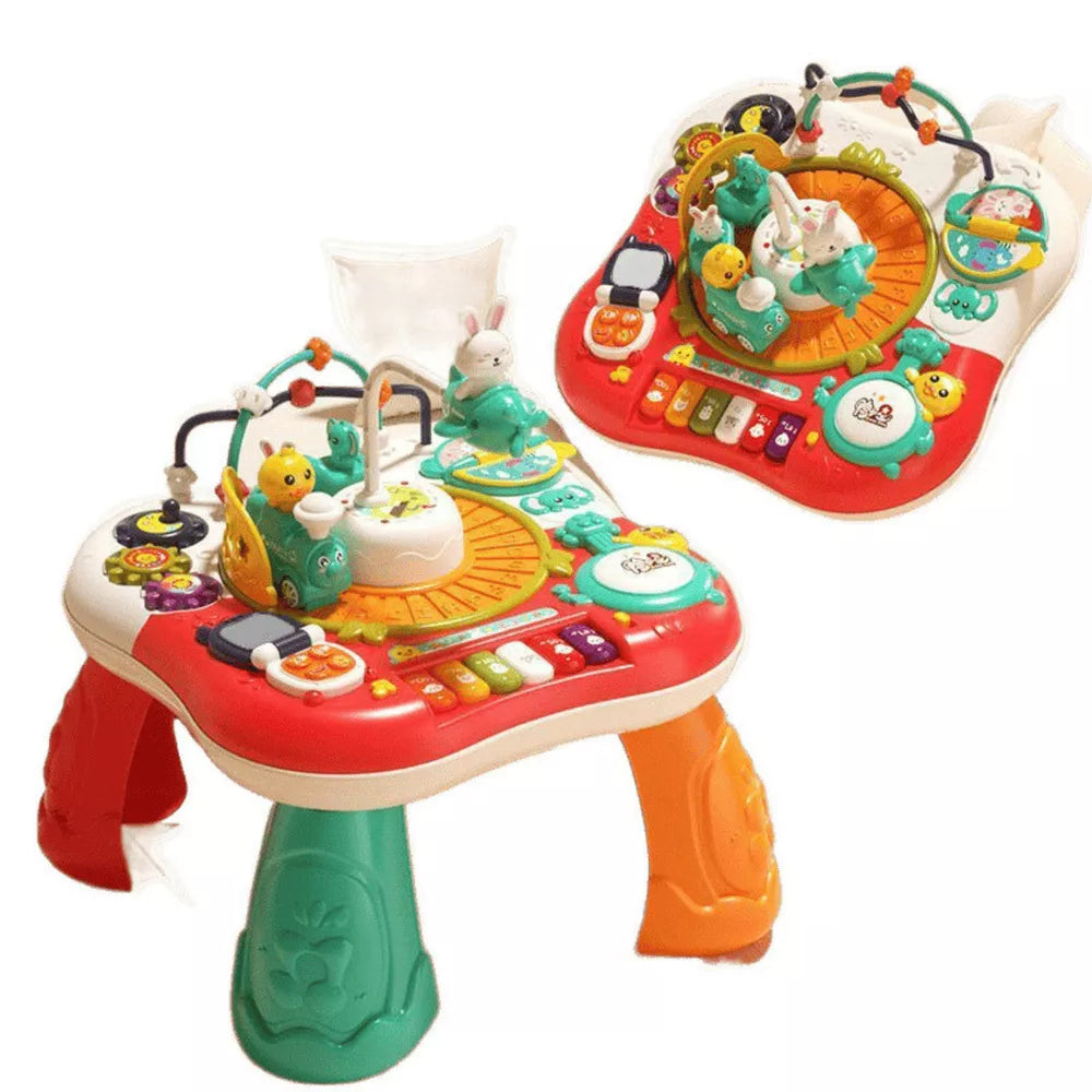 Šis 2-in-1 interaktyvus edukacinis stalas yra daugiafunkcis žaislas, derinantis mokymąsi su linksmybėmis. Jame yra pianinas, imituojamas telefonas, besisukantys ratai, krumpliaračiai, judančios dalys ir šviečiantys mygtukai, kurie suteikia vaikams įvairių stimulių, lavinančių jų pojūčius, vaizduotę ir rankų įgūdžius. Dėl plataus funkcijų spektro vaikai žaisdami mokosi apie garsus, spalvas ir formas.