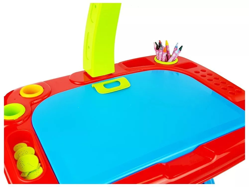 Staliuko surinkimas labai paprastas, kiekvienas gali su juo susidoroti. Be to, į komplektą įeina kėdė, todėl galėsite patogiai sėdėti ir kurti piešinius. Stalo šonuose yra puodeliai, kuriuose galite laikyti kreideles ir priedus. Viskas visada bus savo vietoje. Magnetai raidžių ir skaičių pavidalu išmokys mažylį pagrindinių matematinių operacijų ir kaip sudėti žodžius. Projektorius yra nustatytas stalo viduryje. Prieš žaisdami pasirinkite tinkamą diską su paveikslėliais, įdėkite jį į projektorių ir paleiskite. Įjungus ant lentos pasirodys paveikslėlis, kuris turi variantus su kontūrais arba spalvotas. Jūsų vaiko užduotis bus nuspalvinti paveikslėlį, kad jis atitiktų mažesnįjį atitikmenį. Kita vertus, šablonai išmokys jūsų vaiką tinkamų geometrinių figūrų pavadinimų. Didelis lentos su projektoriumi pranašumas yra malonios spalvos, formos be aštrių briaunų ir daugiafunkciškumas.