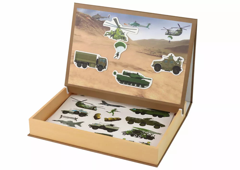Dėžutės dangtis slepia magnetinę lentą su dykumos mūšio tema, ant kurios vaikas gali dėlioti magnetines dėliones, kurdamas savo taktines sistemas ir karo scenarijus. Gebėjimas savarankiškai kurti dekoracijas lavina loginį mąstymą ir planavimo įgūdžius.