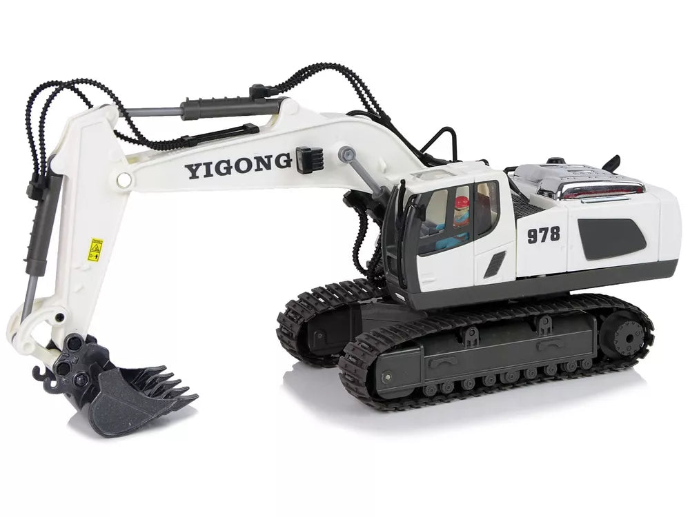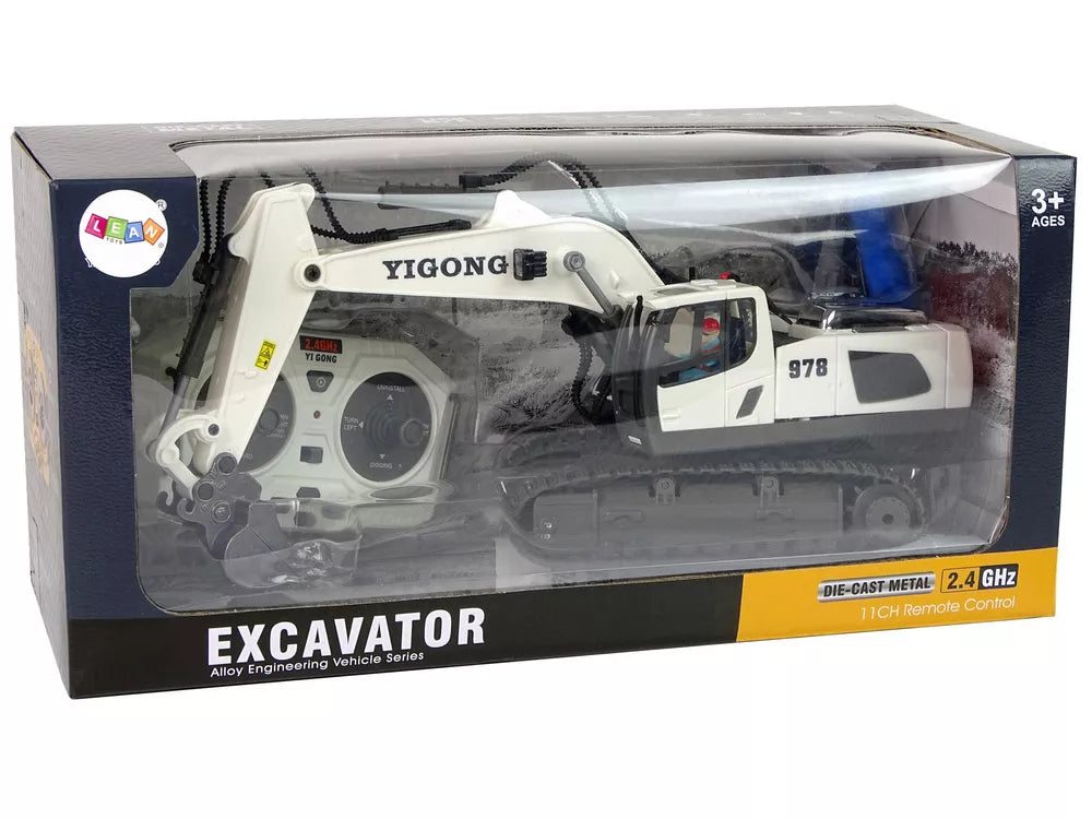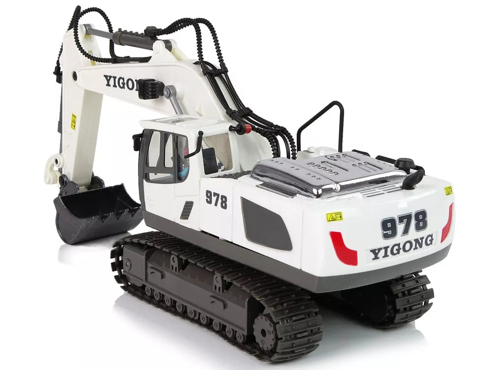 Nuotoliniu būdu valdoma statybinė transporto priemonė yra realistiškai atkurtas modelis. Baltas ekskavatorius dekoruotas juodomis detalėmis, taip pat išskirtiniais lipdukais. Nuotolinio valdymo pulto dažnis yra 2,4 GHz. R/C nuotolinio valdymo pulto valdymas yra labai paprastas, du vairasvirtės leis patogiai manevruoti. Su jo pagalba ekskavatoriaus operatorius gali vairuoti ekskavatorių, keisdamas važiavimo pirmyn/atgal ir dešinėn/kairėn kryptis, reguliuoti garsumą ir, svarbiausia, judinti kaušą. Šone ant kaušo sumontuota lemputė, kuri įjungus apšviečia zoną.