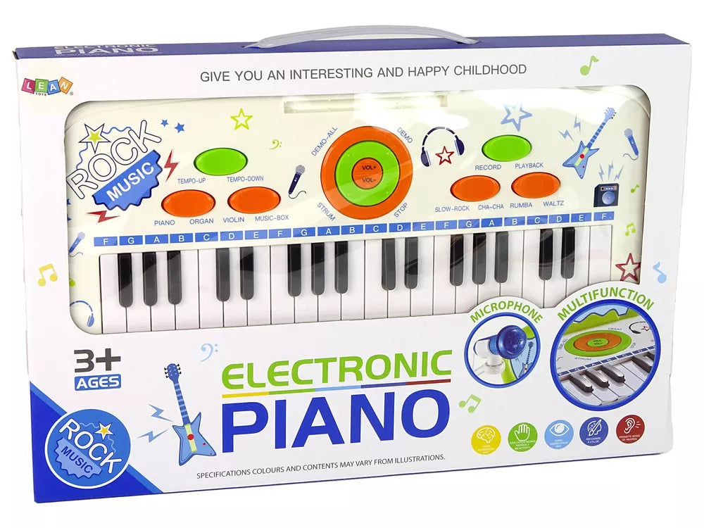 Klaviatūra turi jungtis galinėje dalyje. Galima įdėti 4 AA 1.5 V baterijas, kurios nepridedamos. Prietaisas turi CE saugos sertifikatą ir tinka bet kuriam vaikui nuo 3 metų amžiaus. Supakuota originalioje dėžutėje, todėl puikiai tinka dovanai.