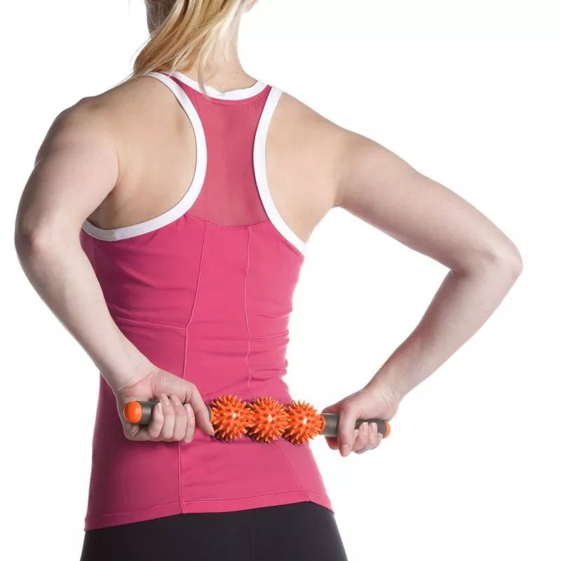 Su šiuo „Gaiam“ masažiniu voleliu stimuliuosite kraujotaką ir malšinsite raumenų skausmą. Volelis yra 41 cm ilgio, turi ergonomiškas, patogias rankenas ir tris nepriklausomus volelius su narelėmis. Rankenos leidžia laikyti volelį rankoje, nereikia jį atremti į sieną. Taip pat galite puikiai reguliuoti masažuoklio spaudimą pagal savo poreikius. Visos dalys laisvai sukasi, užtikrindamos maksimalią raumenų stimuliaciją.