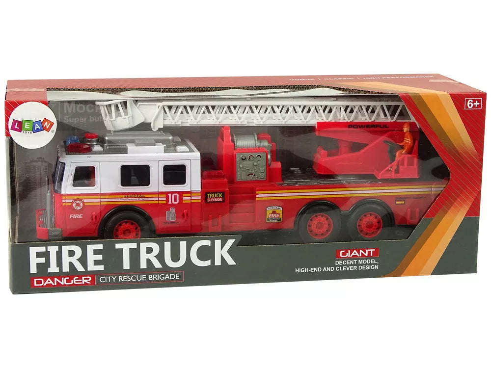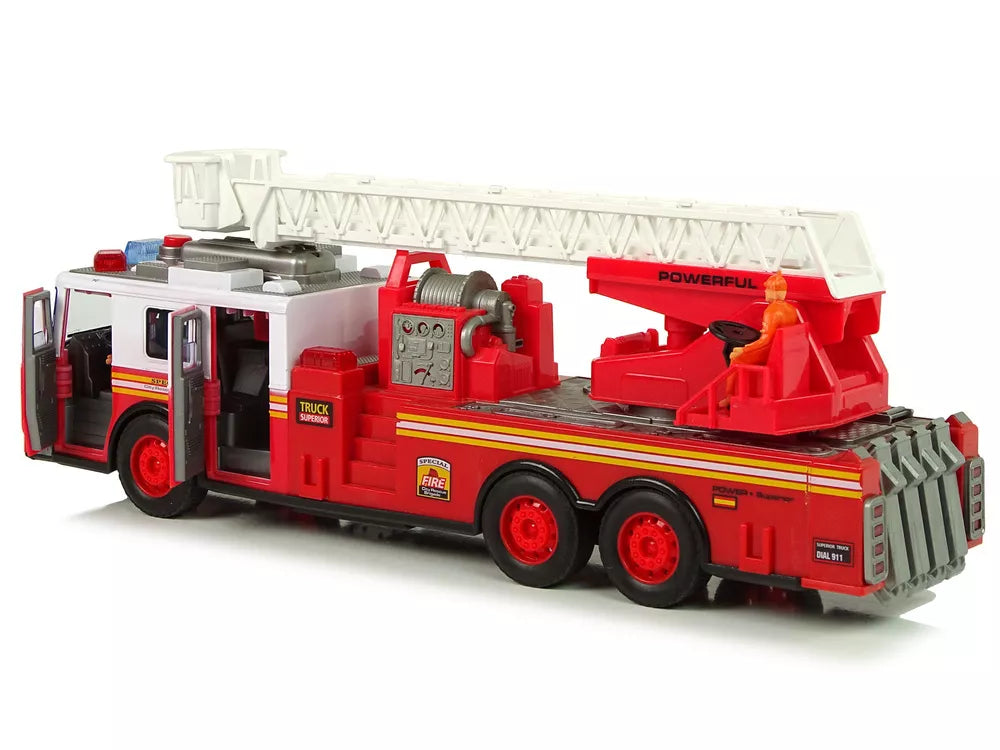Raudona gaisrinė mašina turi reguliuojamas kopėčias, kurias galima kilnoti aukštyn ir žemyn, taip pat ilginti ir trumpinti. Be to, jas galima pasukti bet kuria kryptimi, kad būtų galima pasiekti daugumą vietų, o maksimalus atstumas į viršų yra 50 cm. Kopėčių apačioje yra platforma, kurioje gali stovėti ugniagesio figūrėlė ir kurią galima valdyti vairu. Sunkvežimis taip pat aprūpintas šviesos ir garso efektais. Priekiniai žibintai ir viršutiniai „gaidžiai“ šviečia, kad transporto priemonė būtų matoma iš tolo. Gaisrinė brigada turi frikcinį galinės ašies variklį su stūmimu, tiesiog stumkite ant galinės dalies, atleiskite į priekį ir mėgaukitės greičiu.