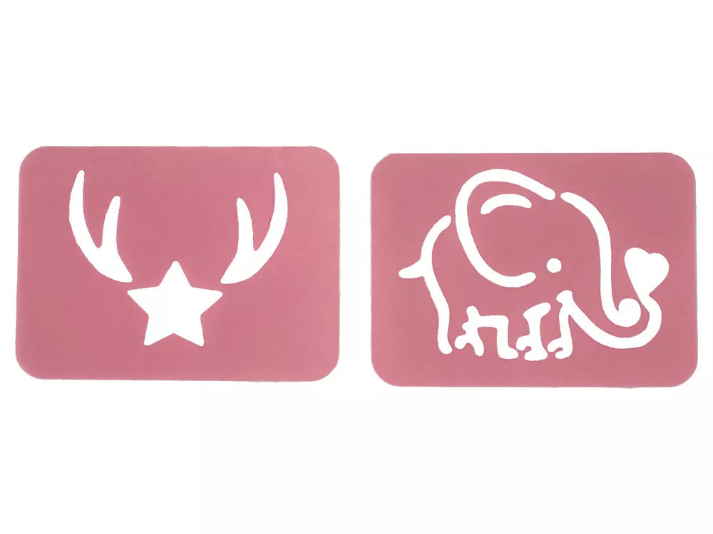 Ir tai dar ne pabaiga! Į mūsų rinkinį taip pat įeina du šablonai dramblio ir žvaigždės formos. Kuo jie išsiskiria? Jie yra didesni už standartinius, o tai reiškia, kad juos galima naudoti įvairiems daiktams dekoruoti. Dramblys ir žvaigždė yra žavingi raštai, kurie suteiks nepakartojamo žavesio kiekvienam jūsų mažosios menininkės projektui.