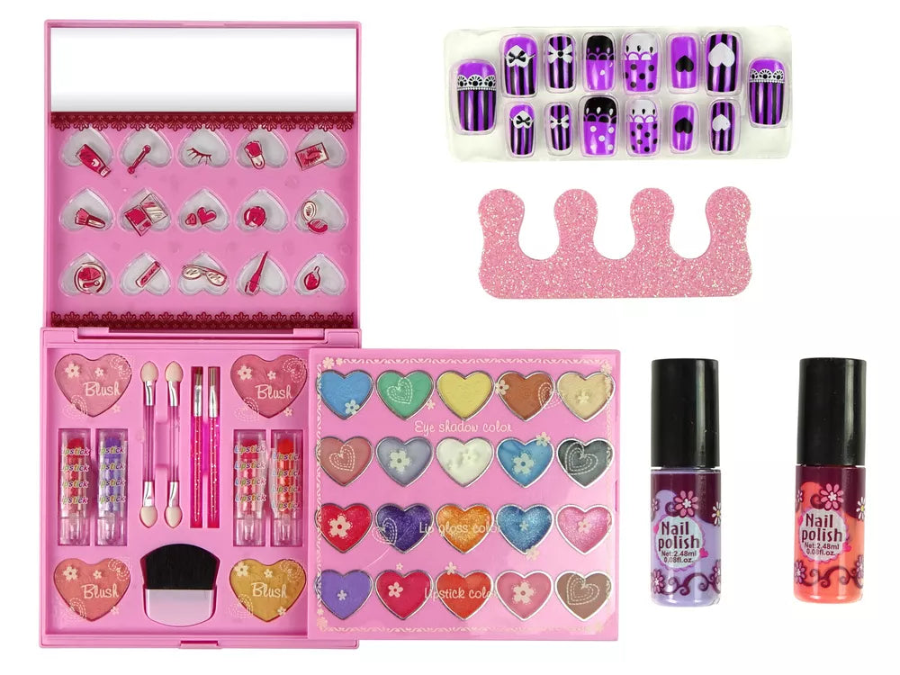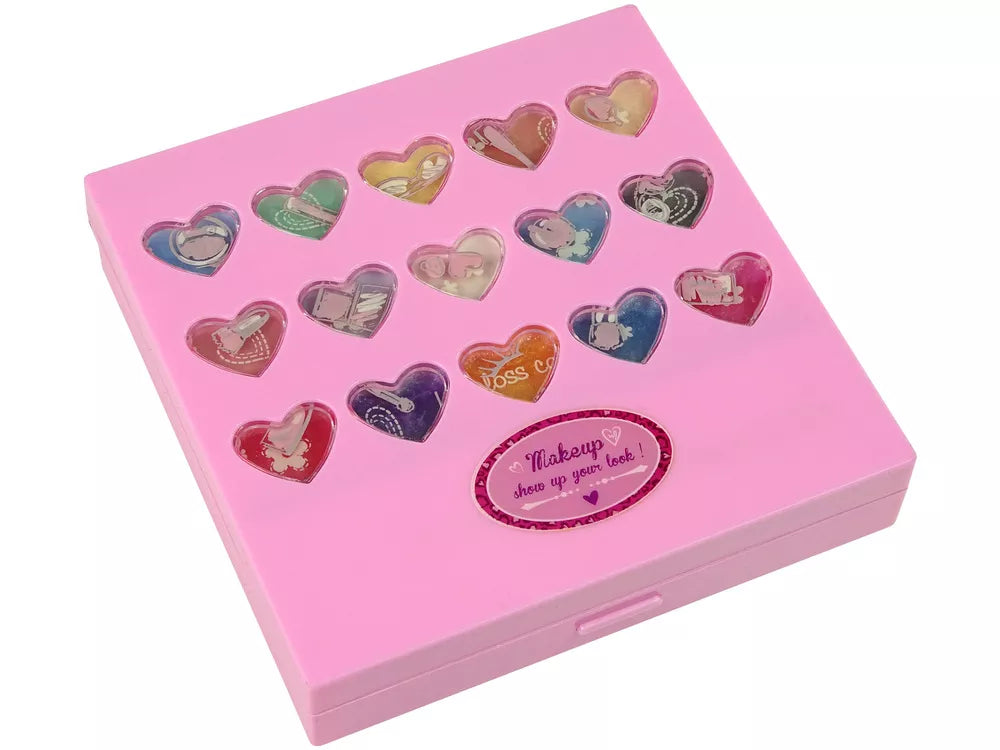 Nuostabiai atlenkiama makiažo paletė, atidaryta slepia daugybę lobių. Išorėje, dėka permatomų širdelių ant dangtelio, matysite, kokios spalvos slypi viduje. Viduje rasite akių šešėlius, blizgesius ir lūpų dažus. Antrame sluoksnyje yra 4 lūpų dažai, skaistalai ir šepetėliai. Be to, rinkinyje yra ir kitų aksesuarų. Nagų lakas, nagų antgaliai leis atlikti tobulą manikiūrą. Mergaitės puikiai praleis laiką mokydamosi makiažo paslapčių.