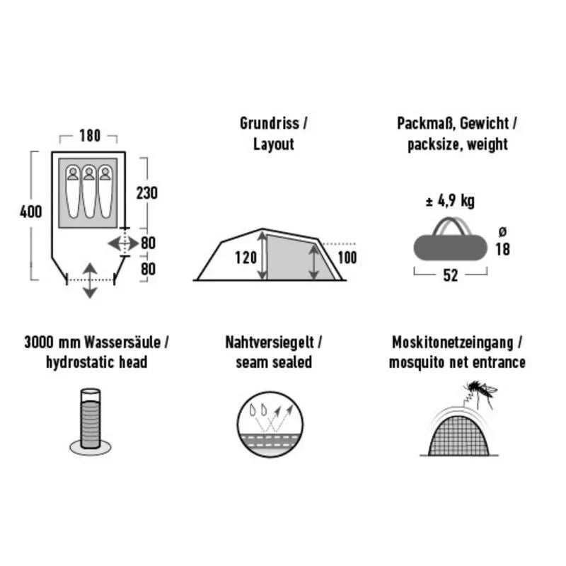 - Palapinė pagaminta iš patvarios, vandeniui atsparios medžiagos.