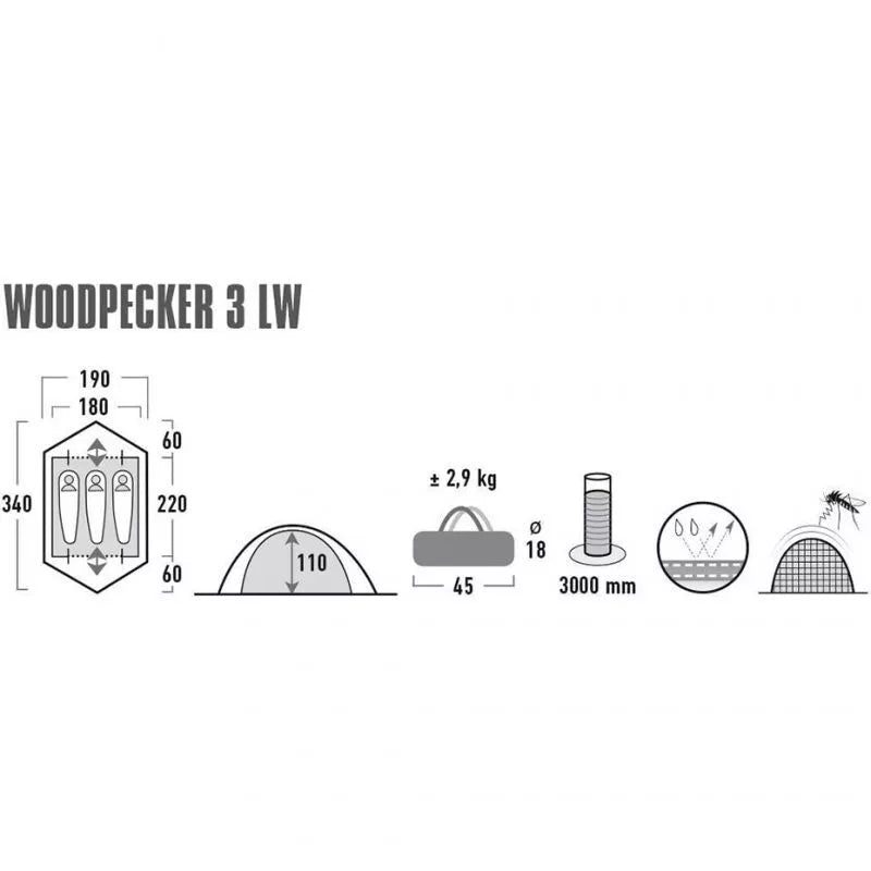 Aukštos viršūnės Woodpecker 3 LW 10195 palapinė Savybės: Erdvi 3 asmenų iglu tipo palapinė yra puiki kelionių palydovė žygiams ir... Skaityti daugiau