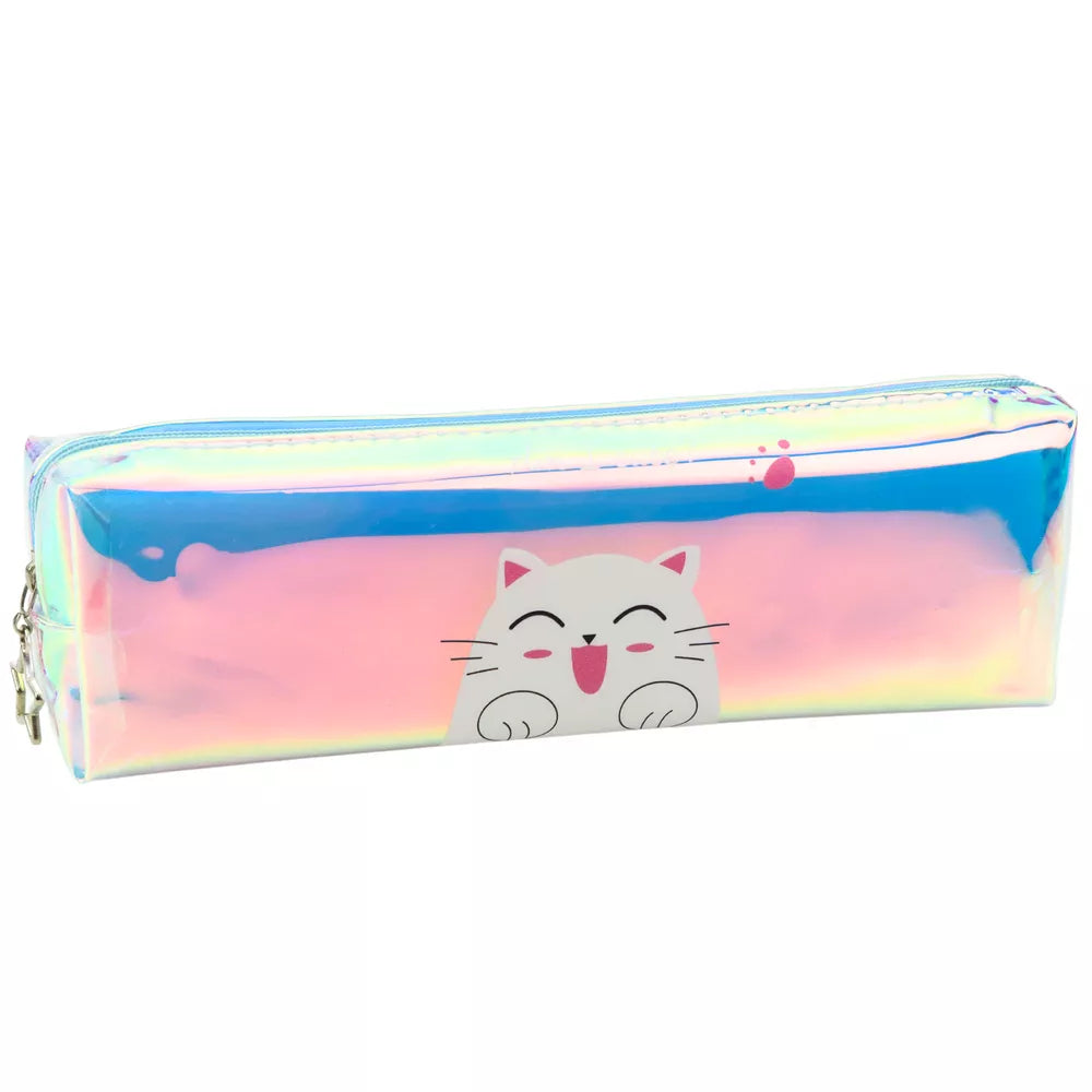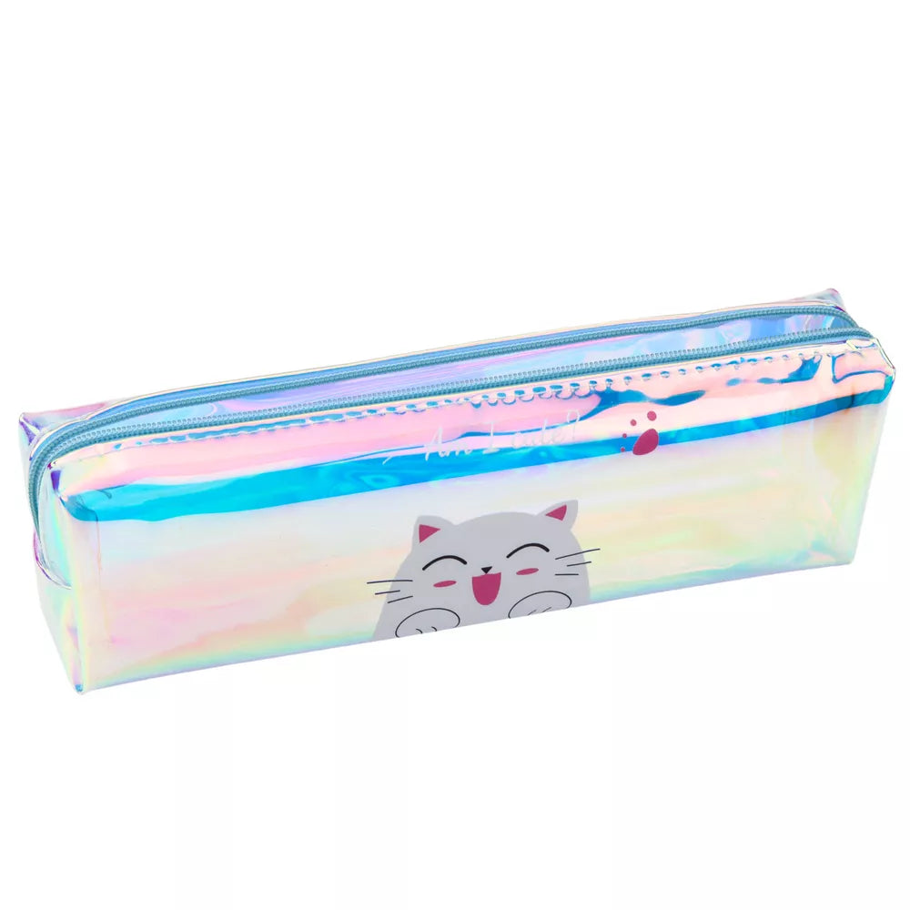 Holografinis mėlynas penalas su kate vaikams į mokyklą, 21x6 cm