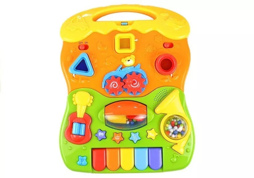 Daugiaspalvis skydelis užpildytas spalvotomis švieselėmis ir mygtukais. Mažylis gali žaisti su besisukančiais barškučiais, raktais ir elementais ant virvelių. Žaislas turi jungiklį ir garsumo reguliavimo funkciją, kuri praverčia, be kita ko, ir vakare. Kaip kūrybiškai panaudoti skydelį? Įvairiais būdais! Paspaudus žvaigždutes, vaikas išgirs smuiką, trimitą ir net būgną. Paspaudus visas žvaigždutes vienu metu, suaktyvinama bendra melodija. Paspaudus elementą ant gitaros, ji bus suaktyvinta, o vaikas pamatys spalvingas šviesas – panašiai veikia ir teisingai parinktos figūros ant stygų. Žaislas taip pat aprūpintas mažu pianinu, kuriuo mažylis gali kurti savo kompozicijas.