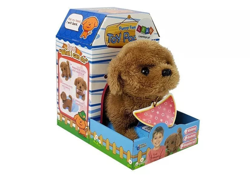 Rudas, pūkuotas šuniukas didelėmis akimis ir mielu kaspinėliu neleidžia nuo jo atitraukti akių. Šuo vaikšto, vizgina uodegą. Paglosčius galvą, jis skleidžia garsus ir išsitiesia, elgiasi kaip laimingas šuo. Be to, jis atidaro burną ir skleidžia garsus. Galite pasiimti savo mažą pliušinį draugą pasivaikščioti ir pamatysite, kaip jis vizgins uodegą iš laimės.