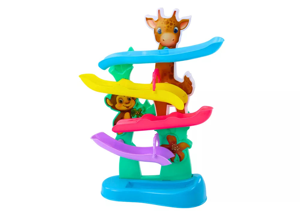 Žirafos kamuoliukų trasa yra nuostabus žaislas, kuris džiugina vaikus savo paprastumu ir patrauklumu. Žaidimas susideda iš kamuoliukų metimo į pirmąjį lataką, iš kurio kamuoliukai rieda žemyn, kirsdami vėlesnius lygius. Kai kamuoliukas pasiekia pagrindą, jis įjungia paslėptą mygtuką, kuris įjungia linksmą muziką ir laukinių gyvūnų garsus, o tai dar labiau praturtina patirtį ir lavina vaiko klausą.