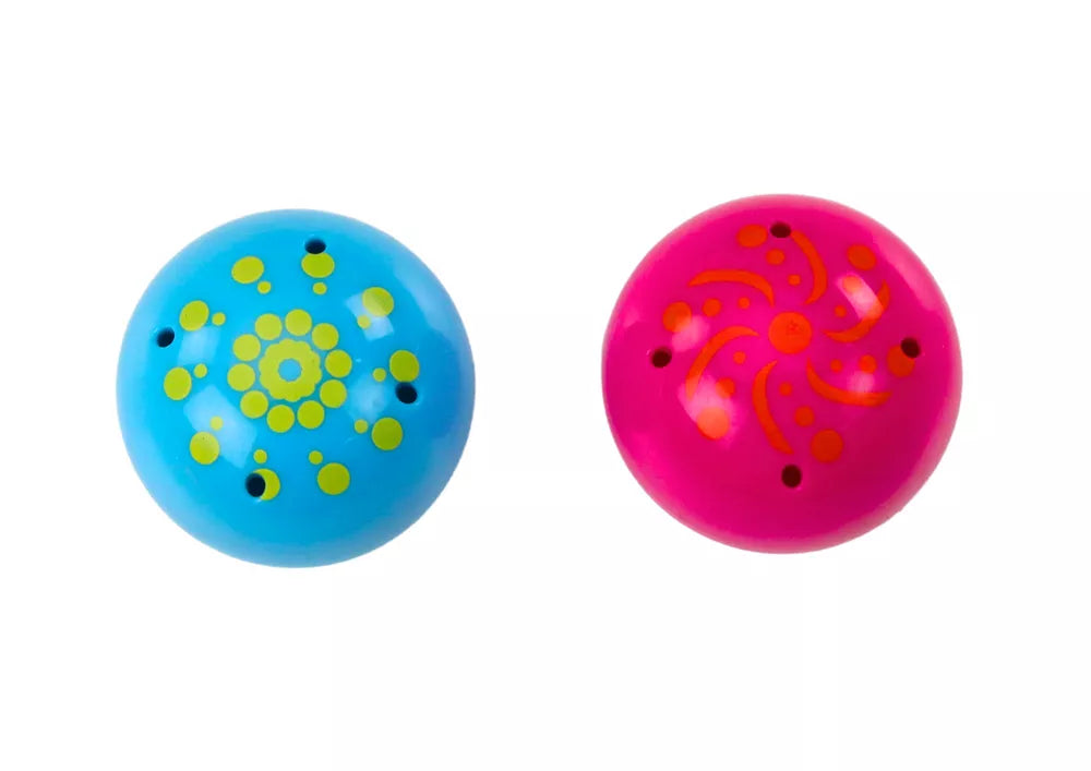 Rinkinį sudaro du 4,5 cm skersmens kamuoliukai, kurie puikiai tinka mažoms vaiko rankutėms, leidžiantys lengvai suimti ir manipuliuoti. Žaislas pasižymi prislopintomis, pastelinėmis spalvomis, kurias vaikai mėgsta, ir intensyviomis kai kurių elementų spalvomis, kurios patraukia jų dėmesį.