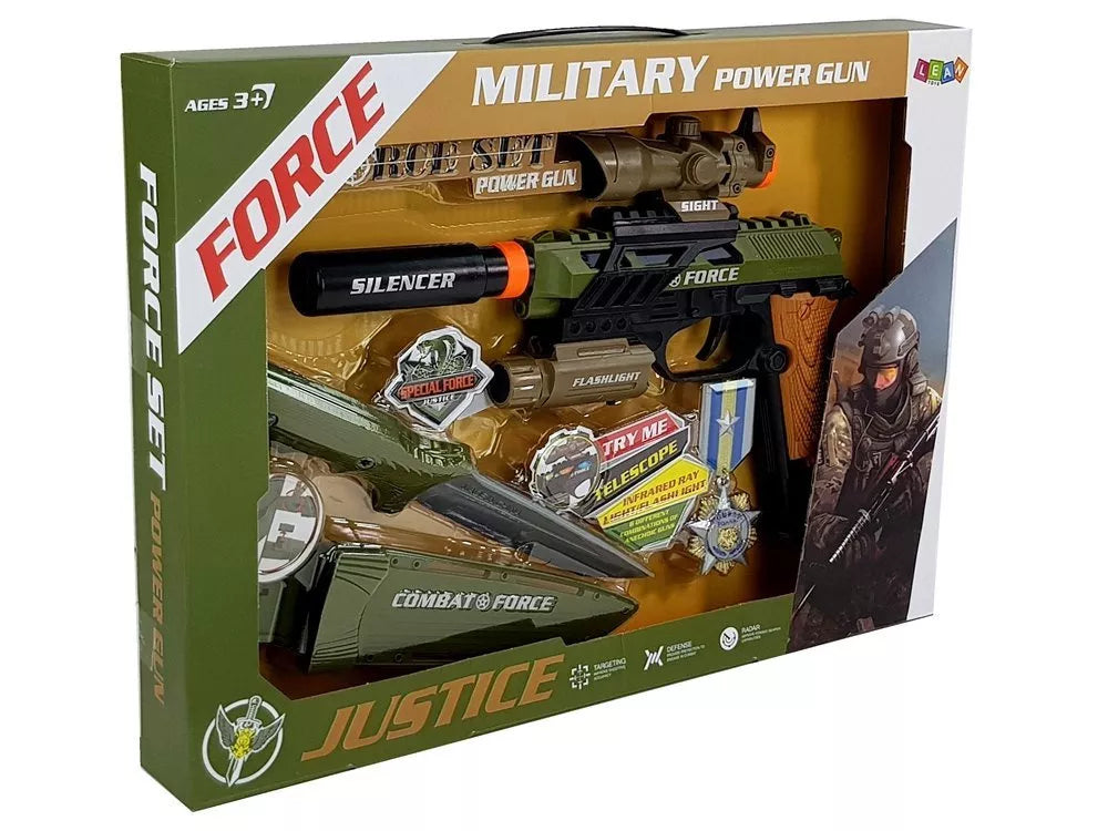 Visi elementai pagaminti iš aukštos kokybės plastiko, kuris garantuoja, kad jie tarnaus jūsų vaikui ilgą laiką. Visas rinkinys išlaikytas tamsiai žalios spalvos schemoje. Paspaudus gaiduką, pistoletas skleidžia šaudymo, perkrovimo ir krintančių šovinių garsą. Pritvirtinus duslintuvą, garsas visiškai kitoks. Atliekant šiuos veiksmus papildomai galite pastebėti šviesos efektus ant ginklo. Joks priešas nepabėgs! Jūsų mažylio vaizduotė tikrai įsibėgės. Kita vertus, siekiant padidinti tikslumą ir taiklumą, pistoletas aprūpintas taikiniu, kuris padarys šūvį tikslesnį. Žibintas papildomai apšvies kambarį. Ilgas guminis peilis taip pat bus nepakeičiamas mūšio metu.