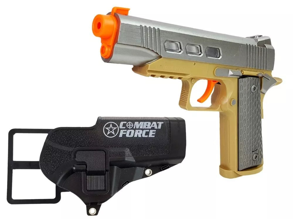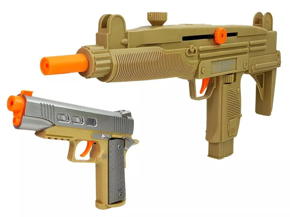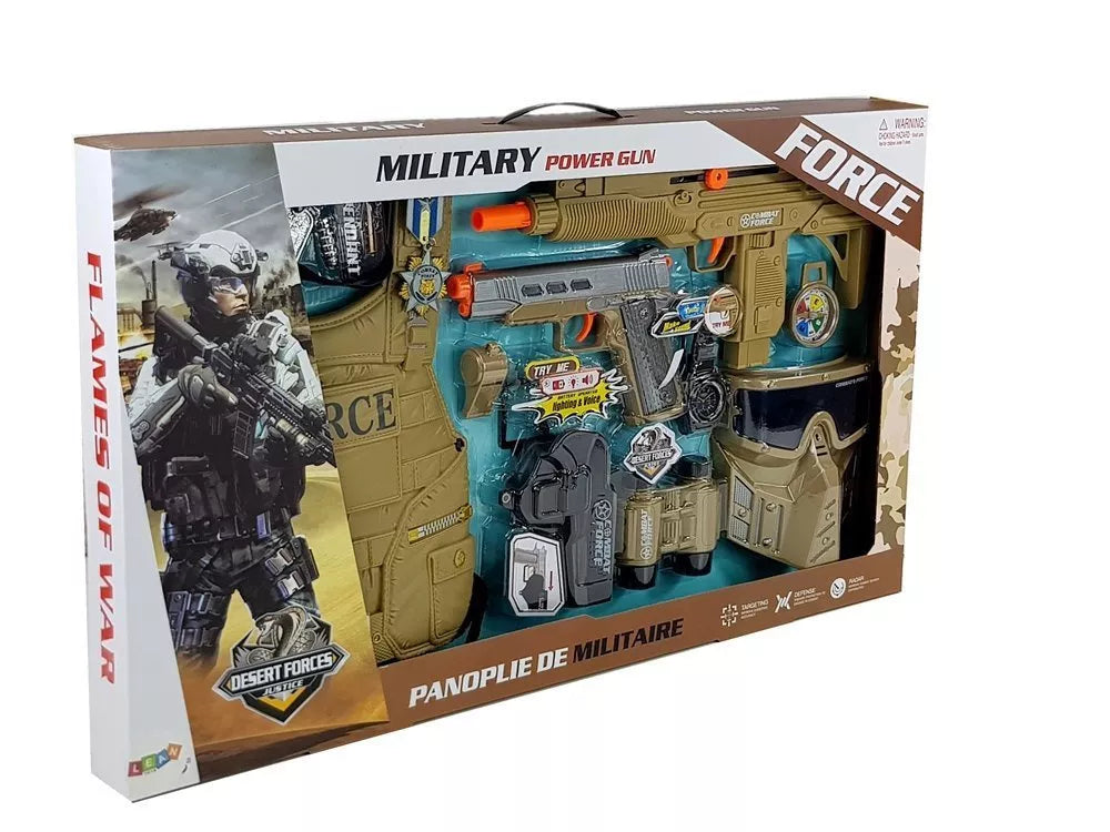 Su priedais jūsų vaikas gali pasiruošti neperšaunamą liemenę, kompasą ir ginklą bei išeiti į mūšį. Pistoletas, kuris yra pagrindinis komplekto elementas, turi specialų įtempimą, imituojantį šaudymą. Po kelių šūvių ginklą reikia įkalti iš naujo. Žiūronai leis jums pastebėti priešą iš toli. Visi priedai pagaminti iš aukštos kokybės plastiko, kuris garantuoja, kad jie ilgai tarnaus jūsų vaikui. Visas komplektas yra šviesiai žalios spalvos.